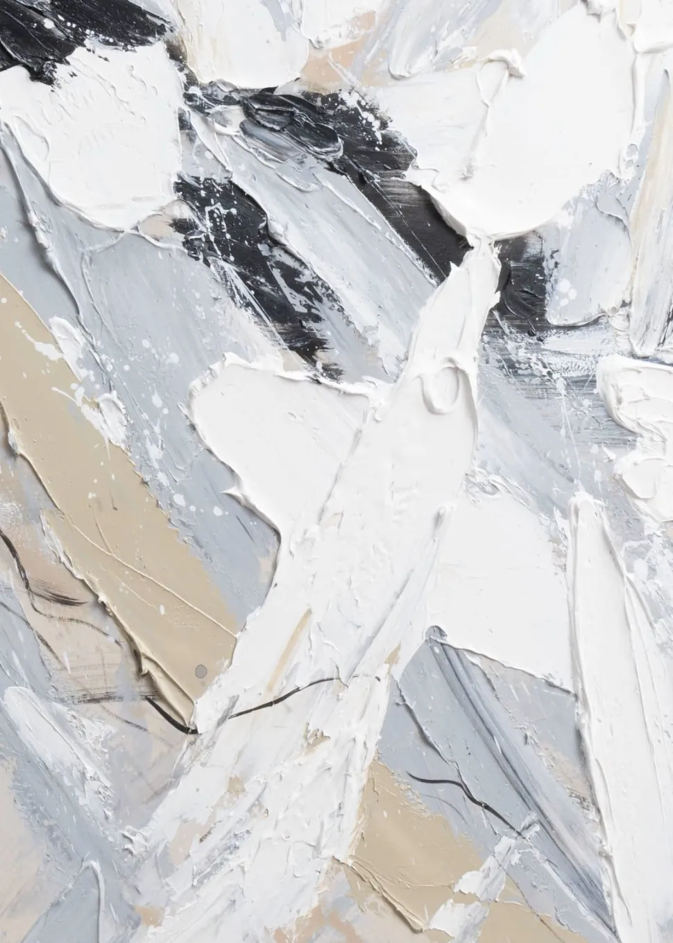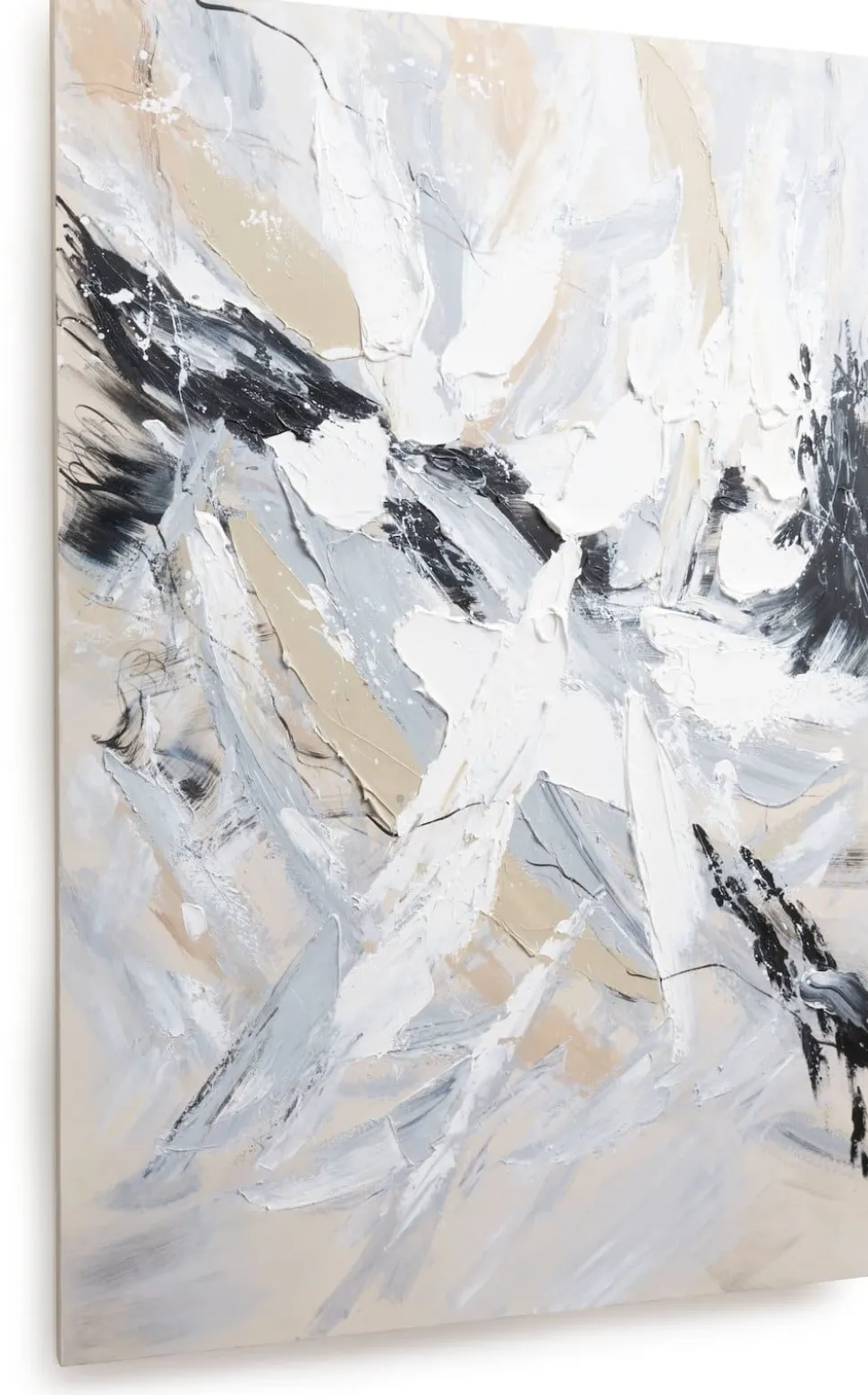 Bij dit flinke schilderij Abstract Power van maar liefst 120 x 180 cm spat de energie van het doek af. Het schilderij is met de hand geschilderd op canvas, en door de dikke verflagen krijgt het een prachtig 3D-effect. De kleuren die zijn gebruikt zijn wit, zwart, grijs en beige. Het schilderij bestaat uit 30% hout (frame), 30% stof (doek) en 40% verf en er zit geen lijst omheen. Ontdek ook de andere schilderijen in de collectie van COCOmaison!