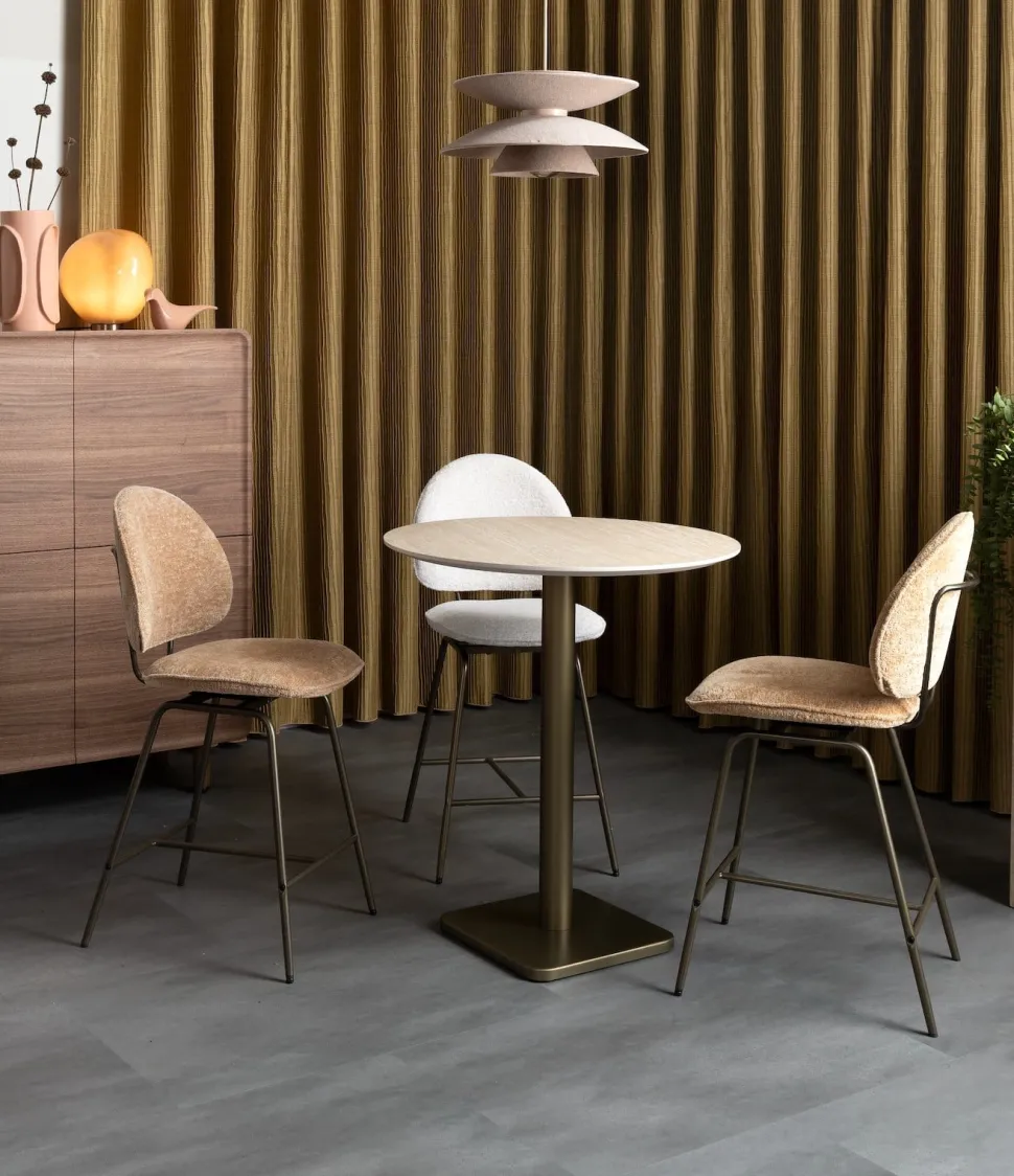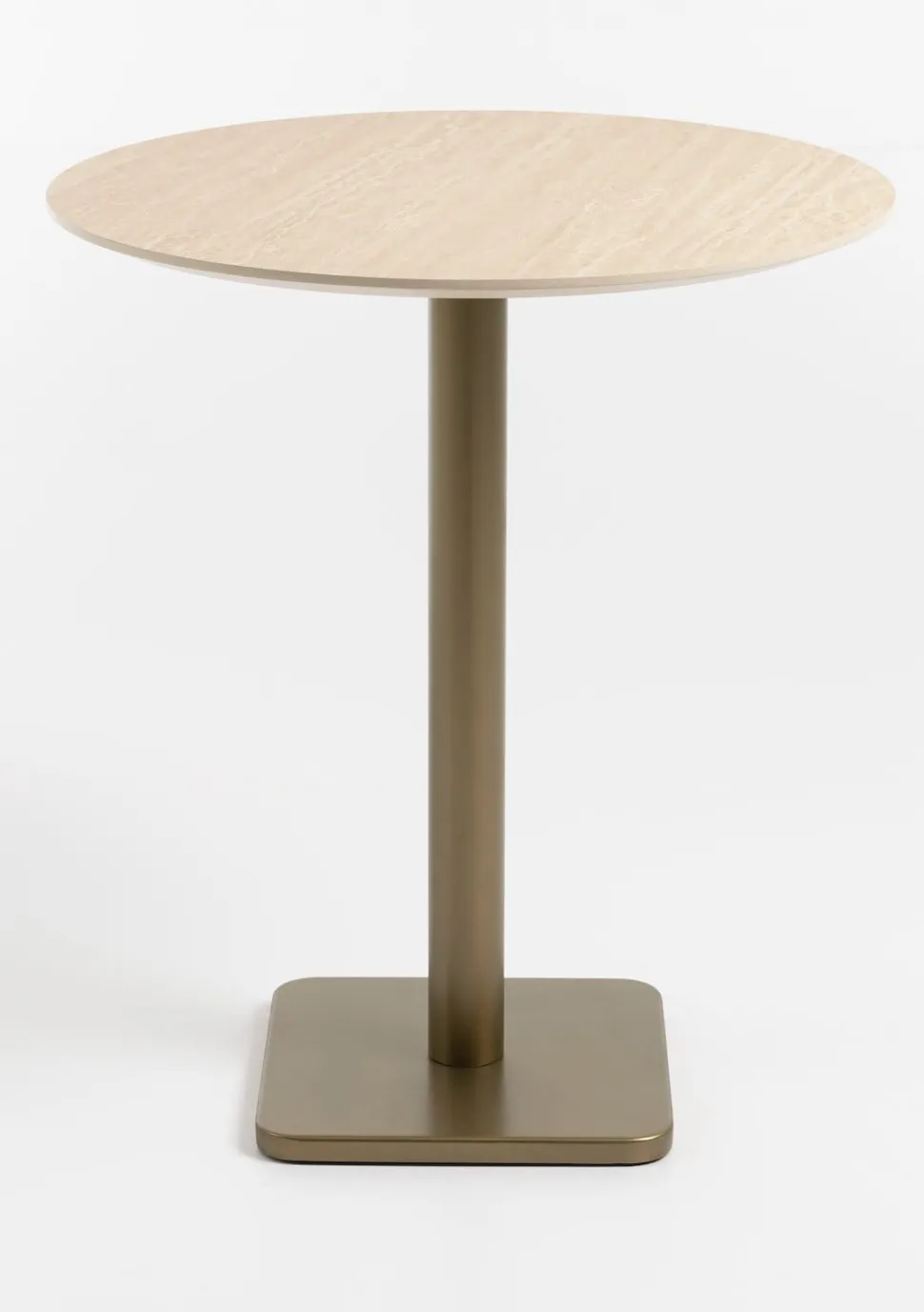 Klein (eet-)hoekje inrichten? COCOmaison heeft dé oplossing voor je! In onze Brest-serie vind je namelijk heel veel leuke bistro- en bartafeltjes. De tafels hebben allemaal een metalen poot, die verkrijgbaar is in goud of zwart en een blad van eikenhout, steen of marmer. Je kunt daarnaast telkens kiezen uit een ronde, vierkant of rechthoekige variant. Door al die verschillende uitvoeringen kun je uit maar liefst verschillende 72 tafeltjes kiezen! Superhandig én stijlvol dus! Dit is de ronde bartafel met een diameter van 80 cm, een goudkleurige poot en een travertin look hpl blad.