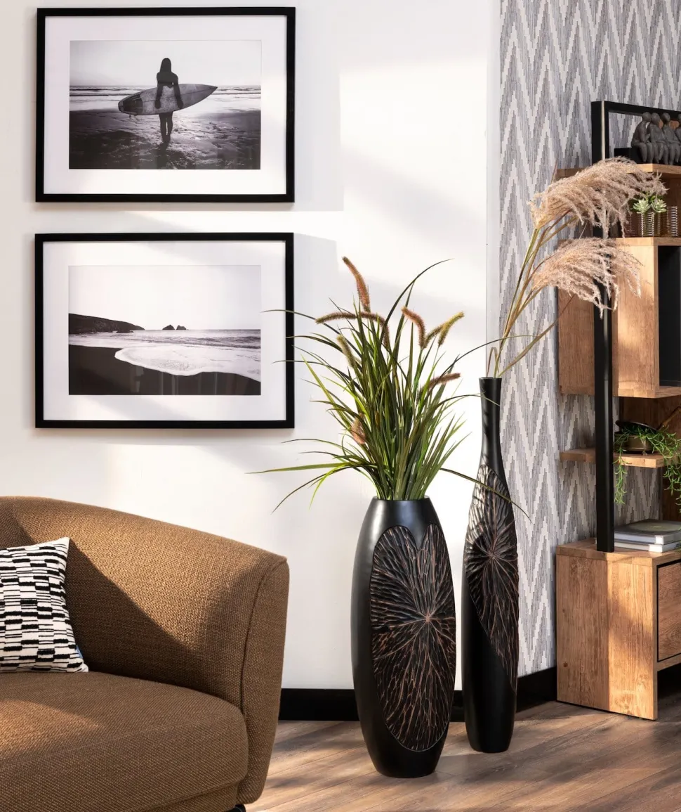 FAYE is een prachtige zwarte hoge vaas uit de collectie van COCOmaison, met een ingekerfd bladmotief. Dit motief geeft de vaas een bijzondere uitstraling, die heel goed past in een landelijke of juist een meer etnische woonstijl. Wanneer je de vaas aankleedt met een enkele lange tak of met pampas benadruk vestig je nog meer de aandacht op het natuurmotief. Deze FAYE vaas is 107 cm hoog en heeft een slanke vorm, maar hij is ook verkrijgbaar in een wat lagere en juist bredere vorm. Beide zijn gemaakt van het lichte, sterke materiaal polyresin, dat ook nog eens waterbestendig is .