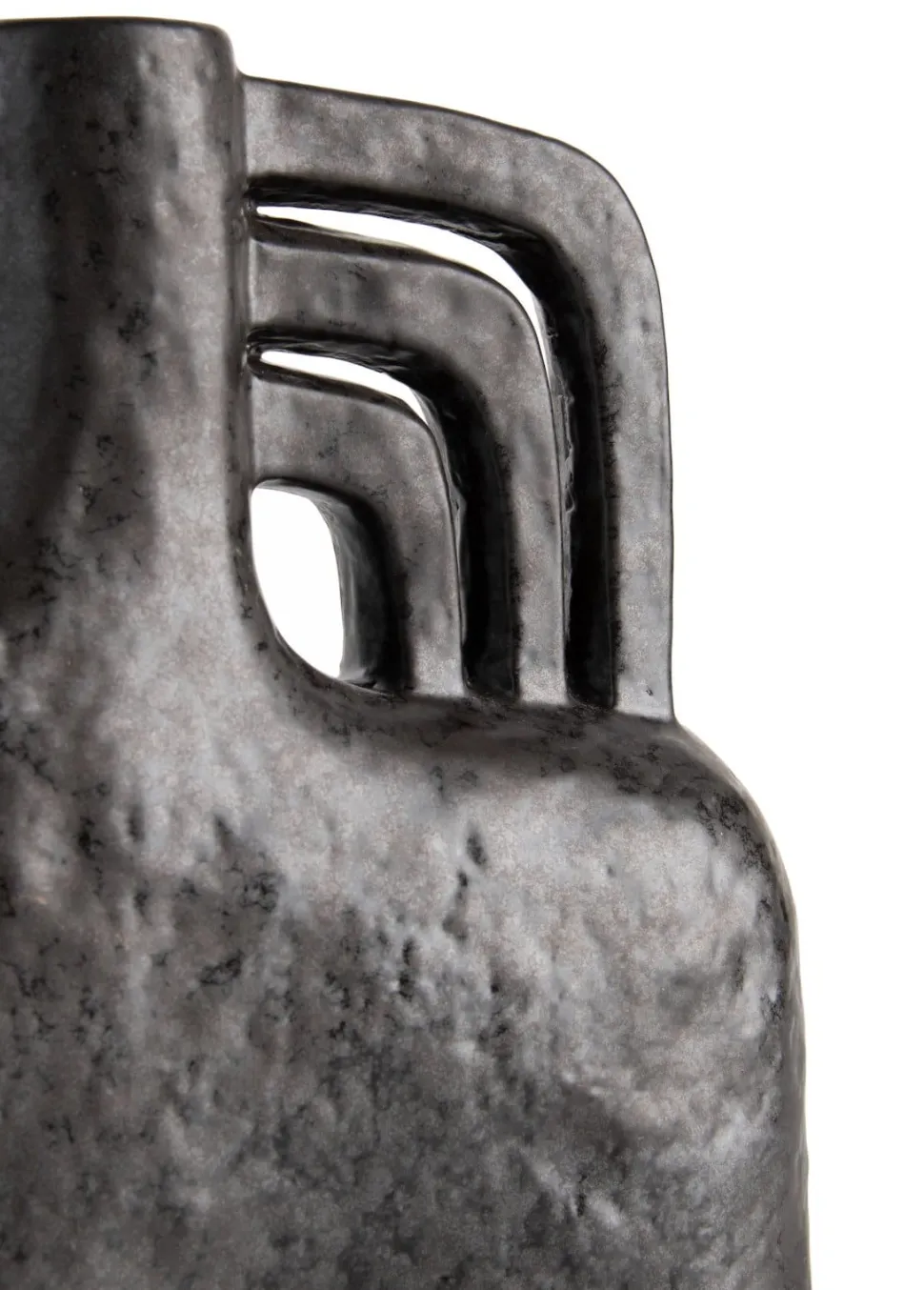 Vazen heb je nooit genoeg toch? Hooguit kastruimte om ze in te bewaren. Nu is dat met de vaas LINA geen enkel probleem, want dit leuke zwarte vaasje van COCOmaison is toch te leuk om op te bergen. Het is van ruw keramiek en heeft een grappig driedubbel handvat. Het heeft een hoogte van 21 cm en een smalle opening. Je kunt er dus een paar bloemen of een kleine tak in steken, maar ook zonder vulling is het een sieraad in de kamer.