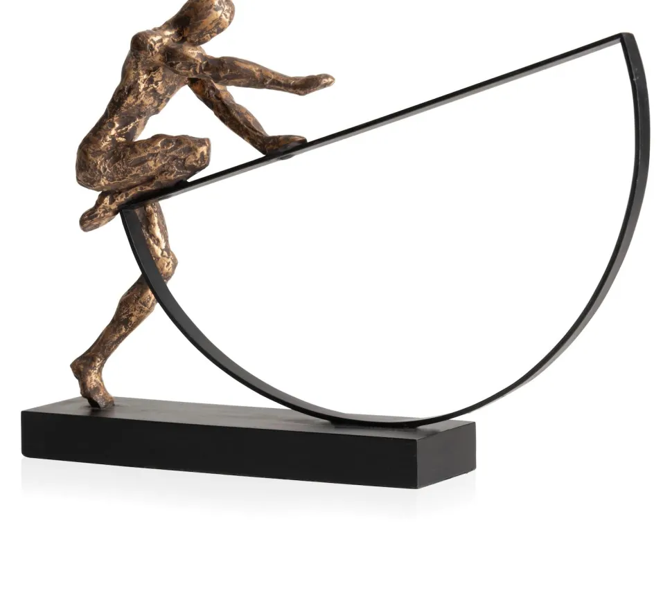 Met dit abstracte beeld Pushing van COCOmaison maak je je styling helemaal compleet. Het met de hand geboetseerde beeld laat een man zien die ene halve cirkel vooruitduwt. Het heeft een zwarte kleur met een mooie vintage gouden finish en is de ideale toevoeging voor bijvoorbeeld je vensterbank of voor een open vak in een kast. Het beeld is gemaakt van een combinatie van metaal en polyresin, is 40 cm breed en 33 cm hoog. Combineer beeld Pushing met het bijpassende beeld Climbing.