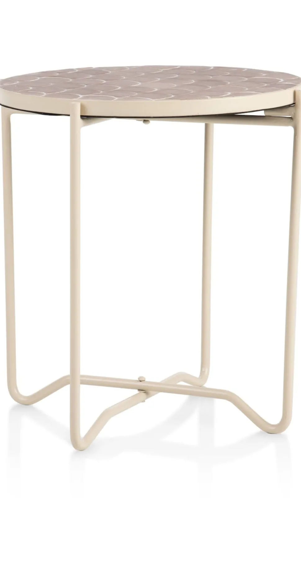 Haal de glamour in huis met de Bento bijzettafel van COCOmaison! Met een diameter van 43 cm en een hoogte van 45 cm is dit ronde tafeltje een kunstwerk op zich, met keramieken tegeltjes in schubbenpatroon in het roze. Het metalen frame met beige finish voegt een luxe toe. Dit veelzijdige meubelstuk kan dienen als bijzettafel, gecombineerd met een poef, of zelfs als trendy plantenstandaard of salontafel. Voeg een vleugje elegantie toe aan elke hoek van je huis met de Bento bijzettafel! Dit tafeltje is ook verkrijgbaar met een zwart/gouden blad.