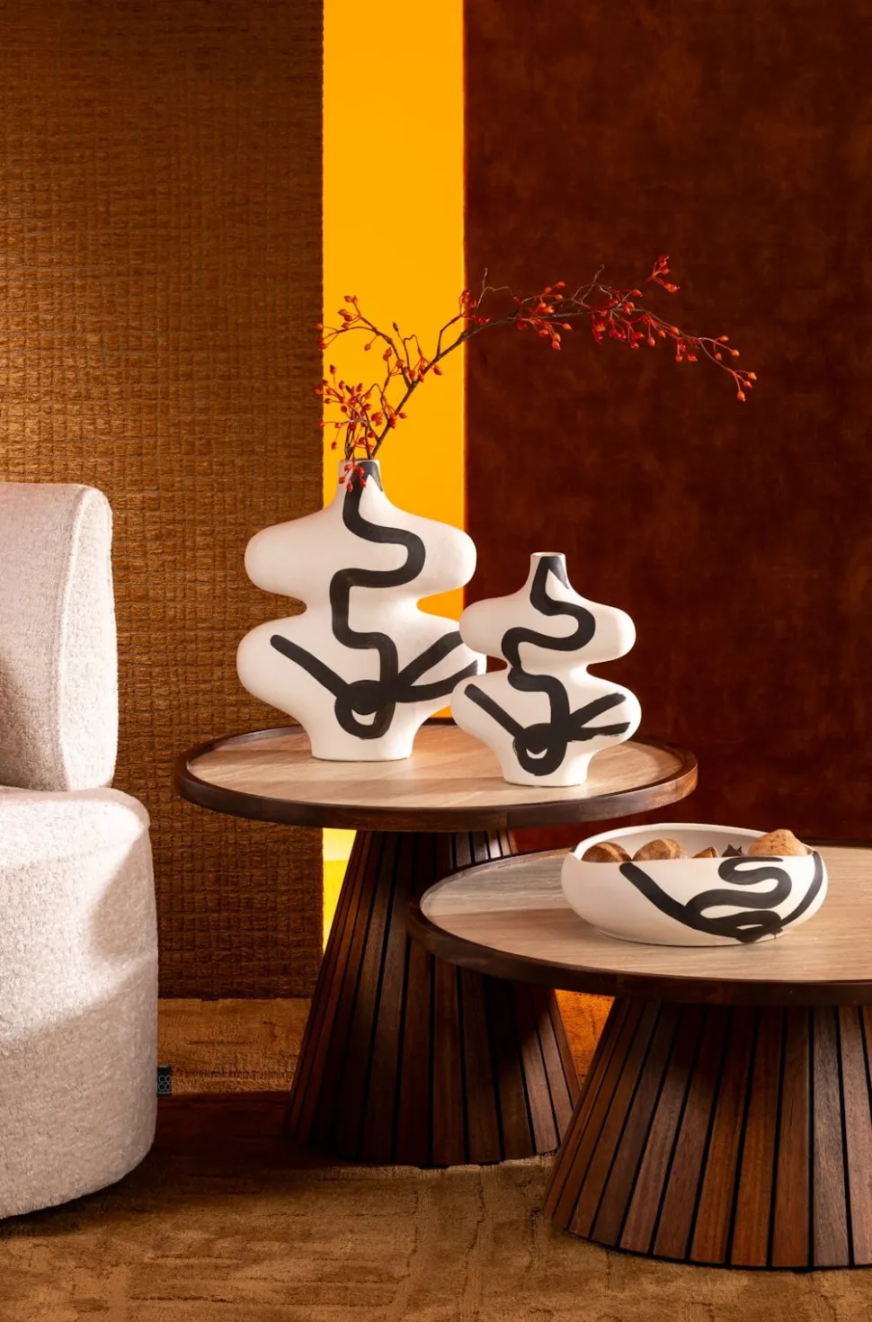 De Curvy schaal van COCOmaison is een strakke, moderne blikvanger die in elk interieur past. Deze stijlvolle schaal is gemaakt van keramiek, heeft een mat witte kleur en een diameter van 29 cm. De zwarte strepen zijn met de hand aangebracht en geven het ontwerp een artistieke touch. De Curvy schaal past perfect op een zwarte tafel, maar staat óók mooi op een marmeren keukenblad. Of je hem nu gebruikt als fruitschaal, of als decoratief object: de schaal geeft je interieur direct extra verfijning. Combineer de Curvy schaal met (een van) de 2 bijpassende vazen.