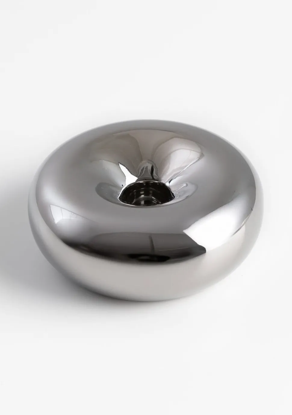 Voeg een vleugje moderne elegantie toe aan je interieur met de unieke Donut kandelaar van COCOmaison. Deze bijzondere kandelaar, gemaakt van keramiek, heeft een opvallende zilveren/chromen kleur die een luxe uitstraling geeft. De kandelaar is vormgegeven als een donut, wat hem tot een kleine eyecatcher maakt in elke ruimte. Plaats hem op een bijzettafel, in een open kast of op een dressoir en laat je interieur stralen met dit stijlvolle en speelse object. Of je nu een gezellige sfeer wilt creëren tijdens een diner of een verfijnd accent wilt toevoegen aan je woonkamer, de Donut kandelaar van COCOmaison is de perfecte keuze. Deze kandelaar heeft een diameter van 12 cm.