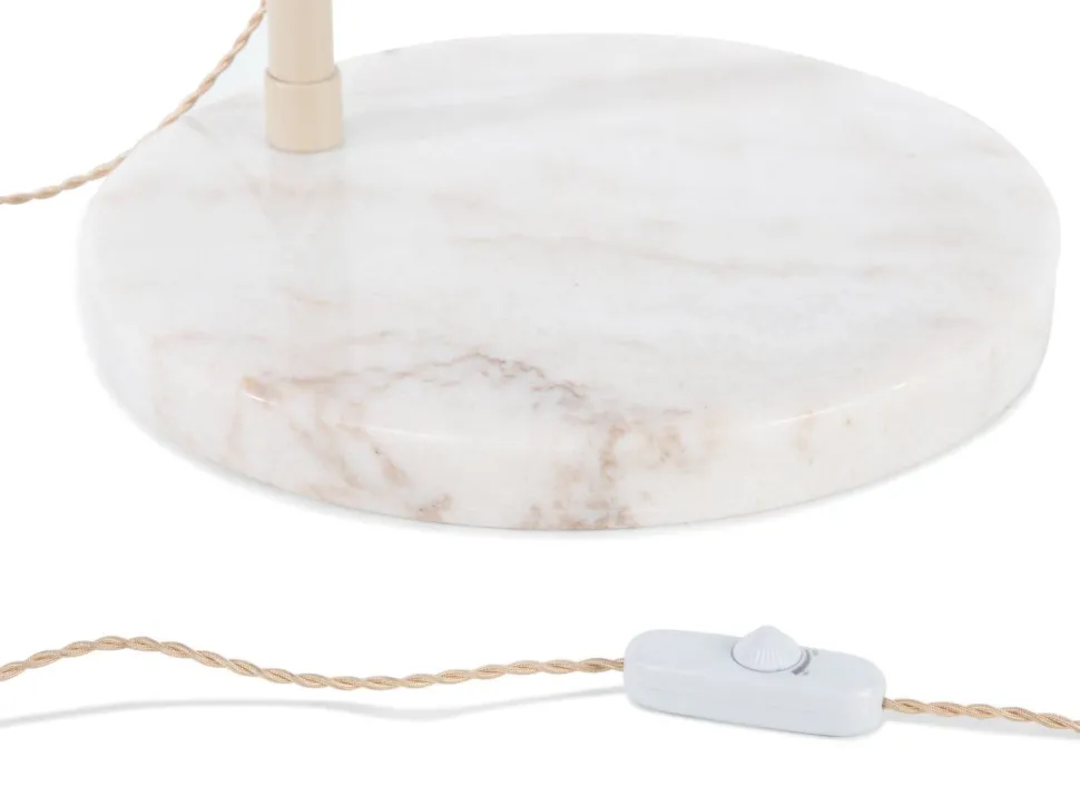 Booglamp JAX van COCOmaison heeft een sierlijke, peervormige lampenkap. De kap is van beige draadstaal en vormt het uiteinde van een lange, sierlijke beige boog, die op een stevige, wit marmeren voet staat. De lamp is heeft een meegeleverde dimmer, zodat je kunt variëren tussen sfeerlicht en voldoende licht om bij te lezen. In dezelfde serie zijn ook een hanglamp en een tafellamp verkrijgbaar.